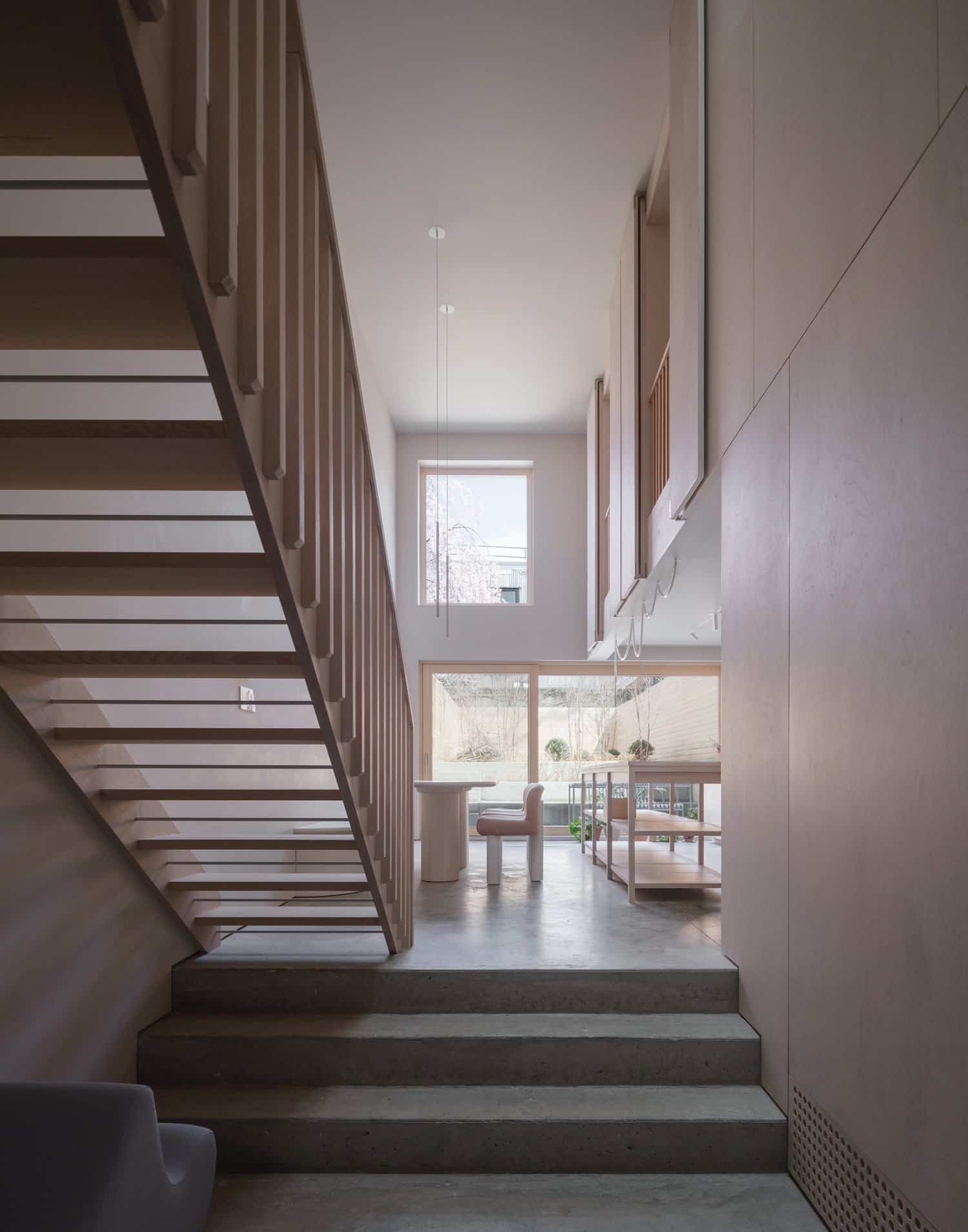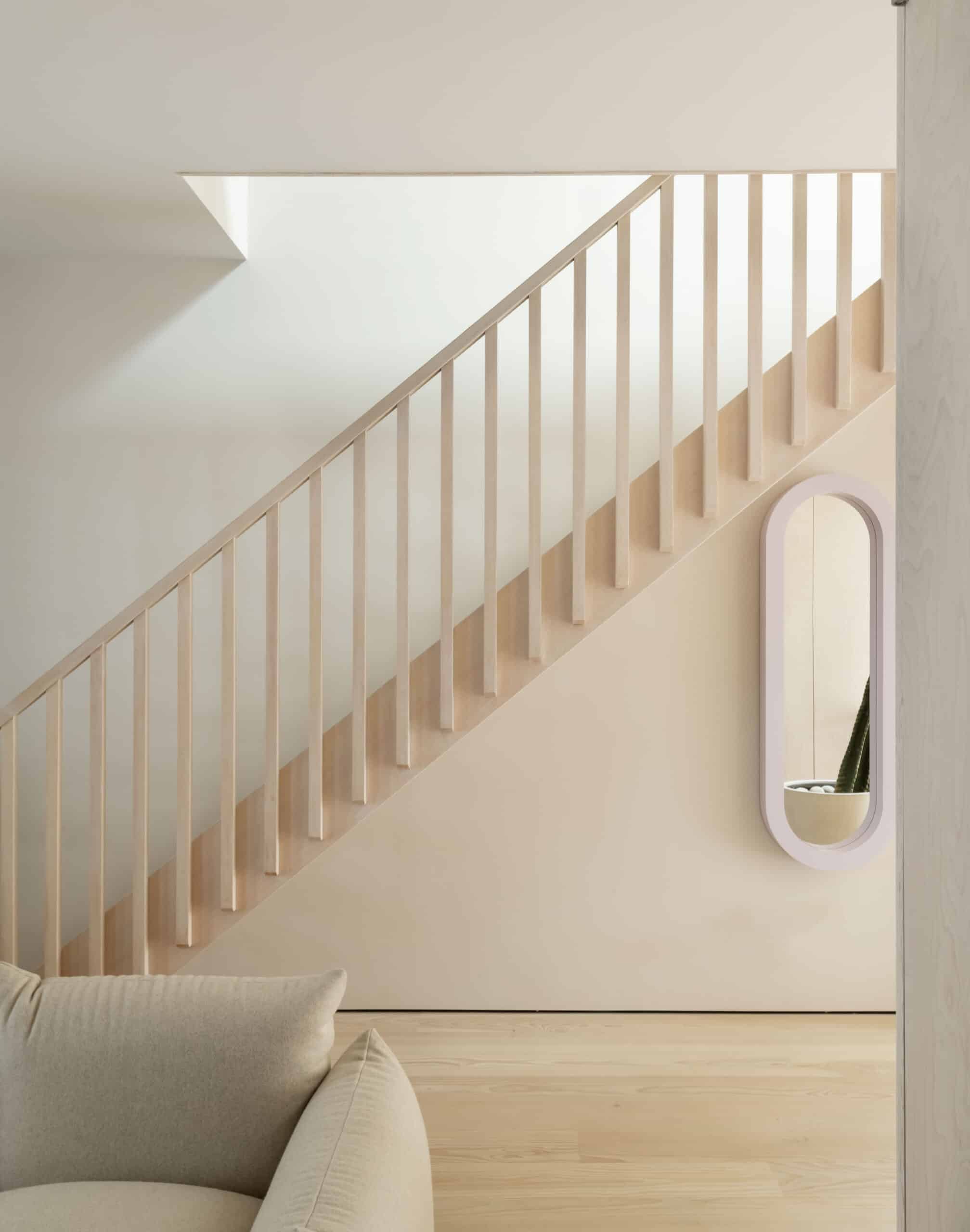A metal rod between stair risers is “a simple way of dealing with building code,” Ransom said. “The stairs let as much light as possible pass into the space.” The treads are Douglas fir, like the flooring on the house’s upper levels.