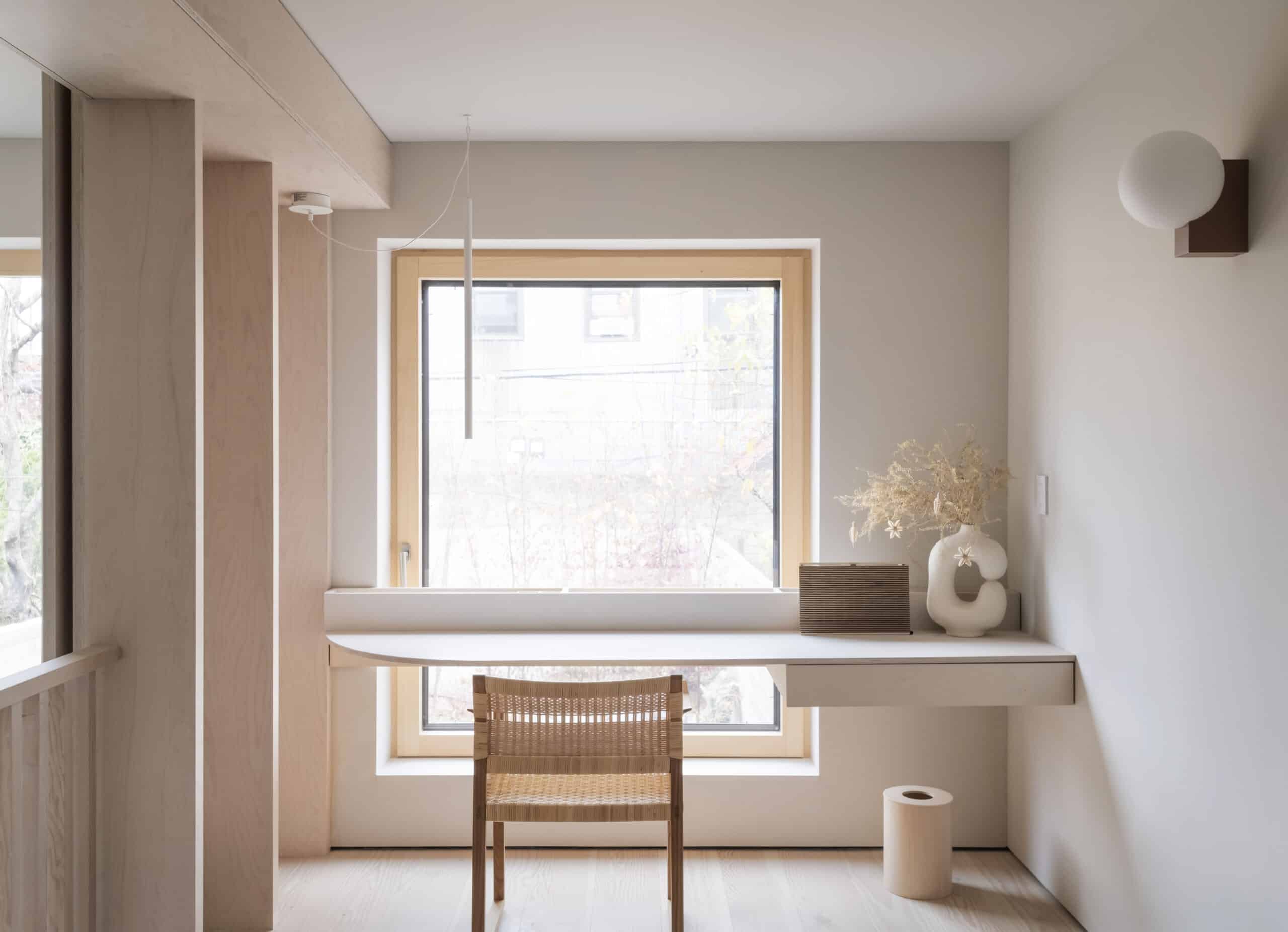 The resulting overhaul features a couple of major architectural moves. “We dug the cellar out,” Ransom said, “and cut a big hole in the parlor floor to create a mezzanine overlooking the cellar space,” now a spacious kitchen opening directly into the backyard (top photo). The long mezzanine, which houses work-from-home space and a piano, among other things, was outfitted with sliding shutters of birch plywood to be opened and closed as desired.