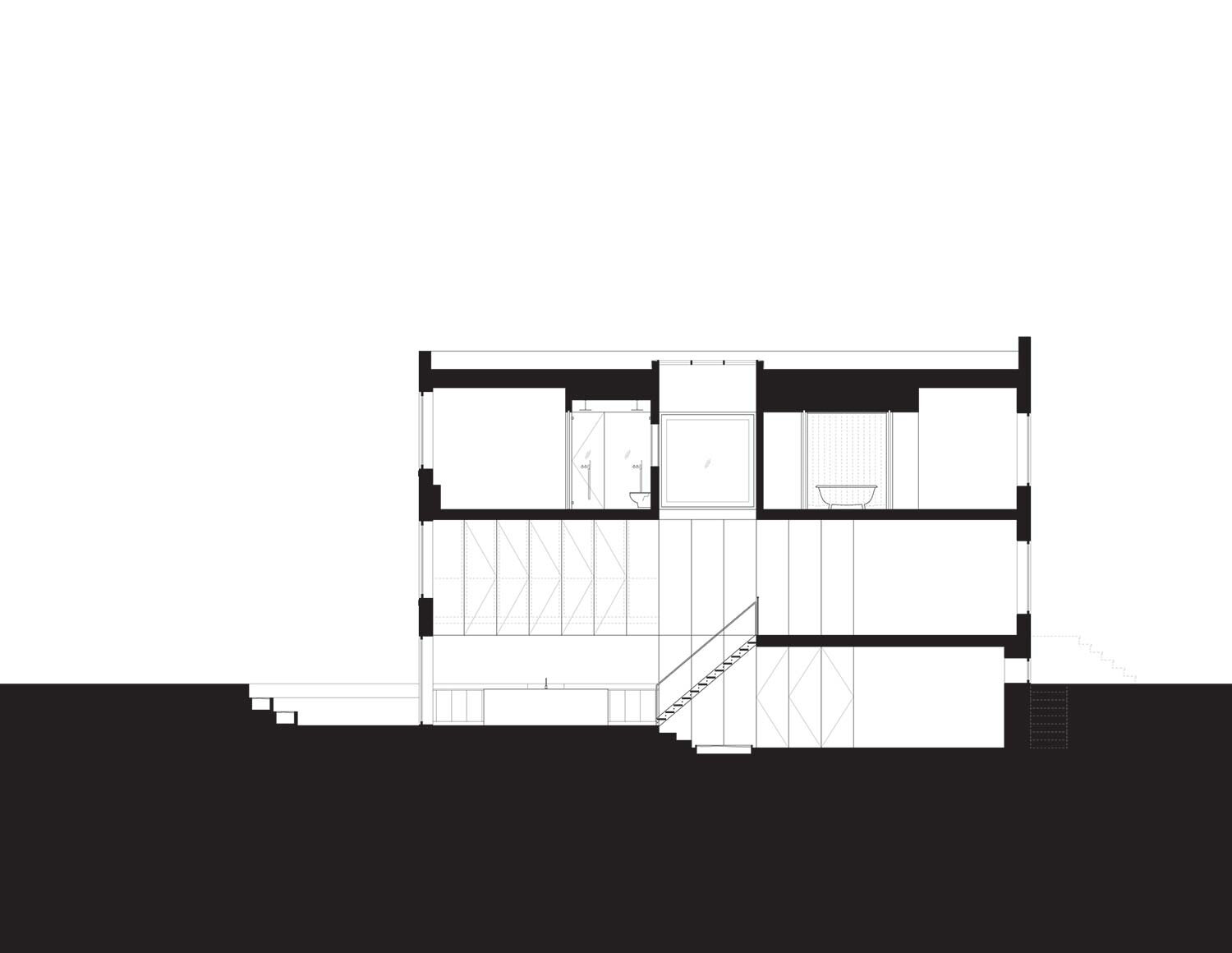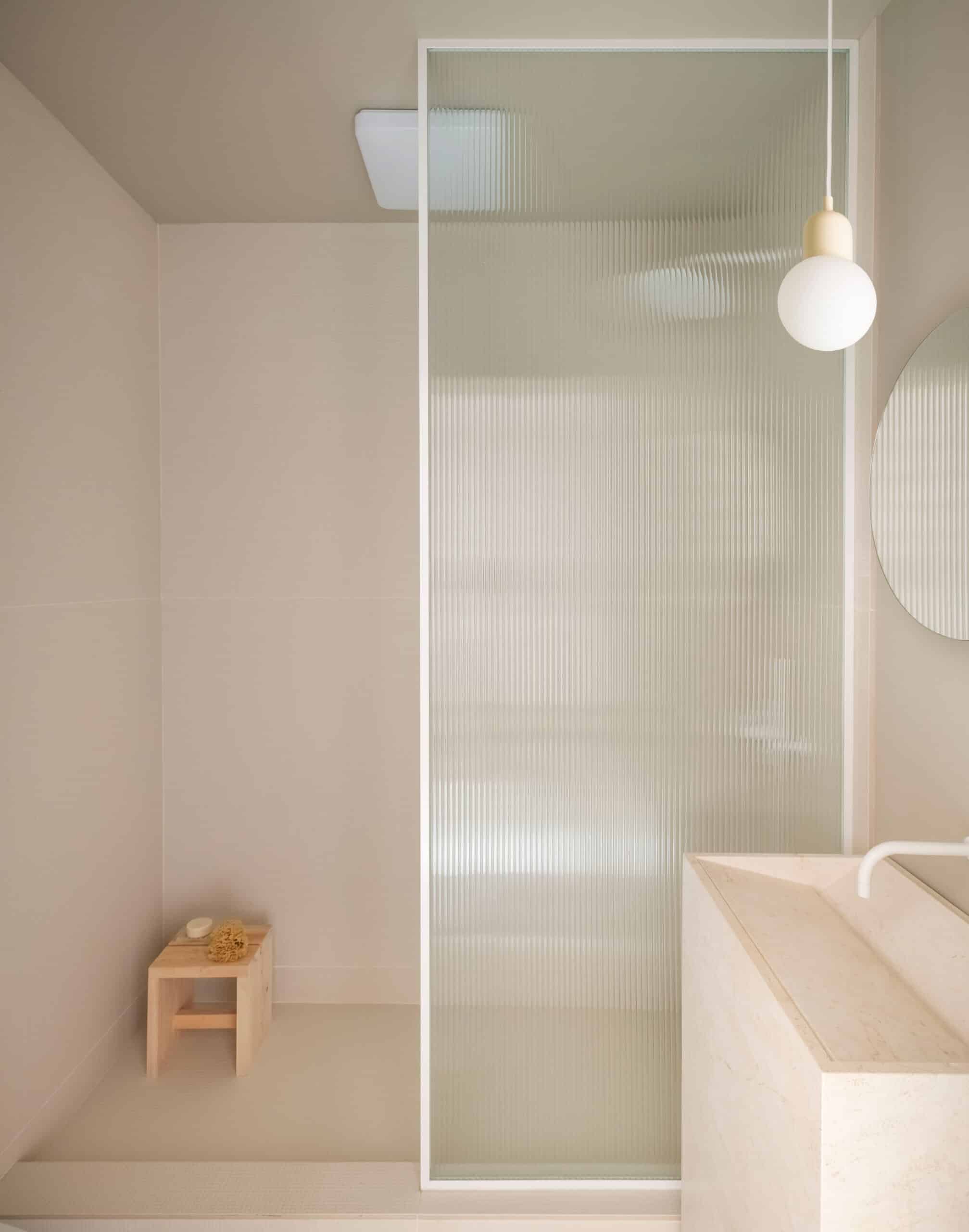 A stall shower of reeded glass and a rectilinear stone basin characterize the lower level bath.