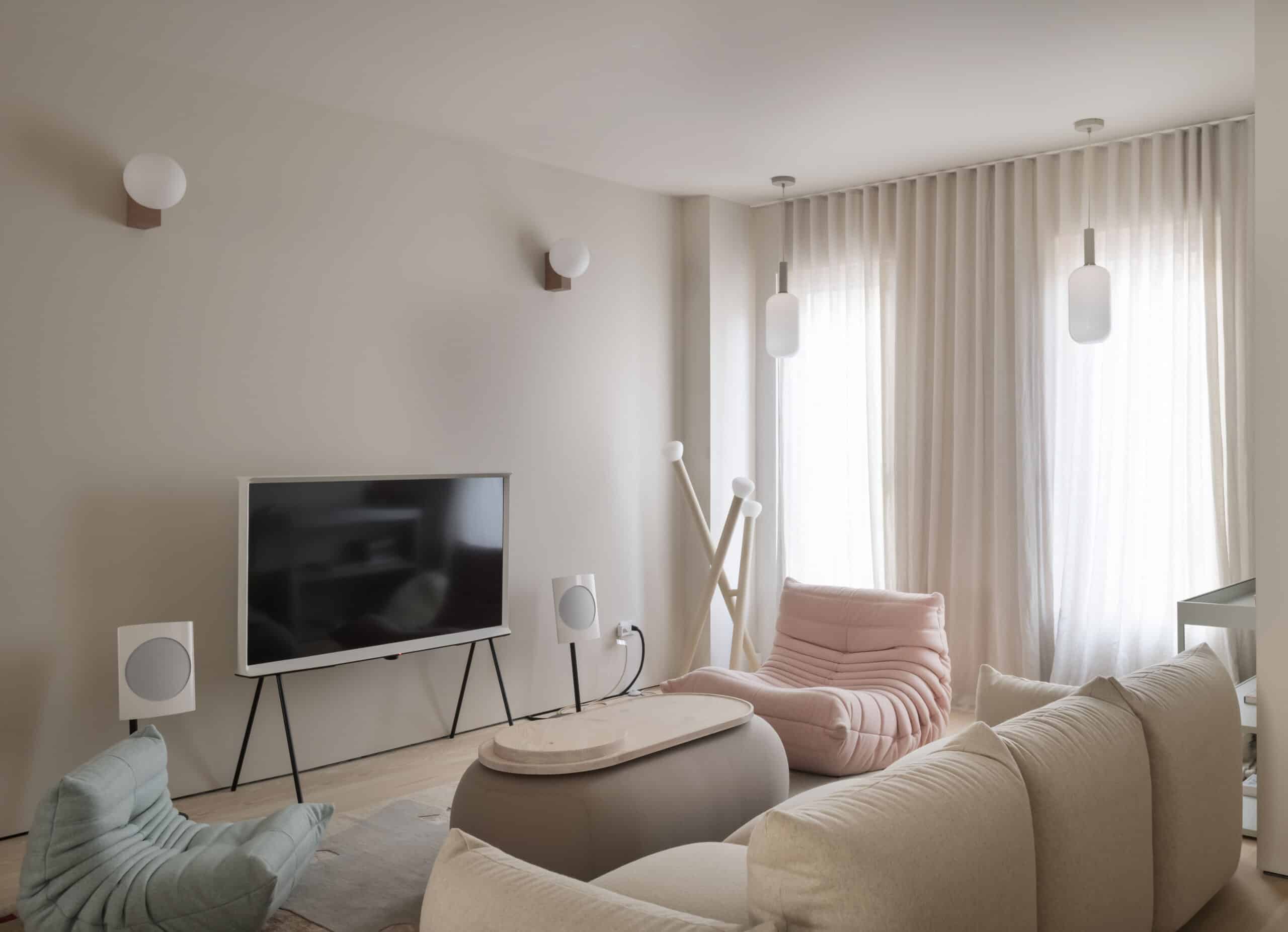 The living room is the first room encountered upon entry to the house. Studio Oink of Leipzig, Germany, led the way on furnishings. “They have a particular sensibility, with a little bit of levity, closely aligned with the owners’ tastes,” Ransom said.
