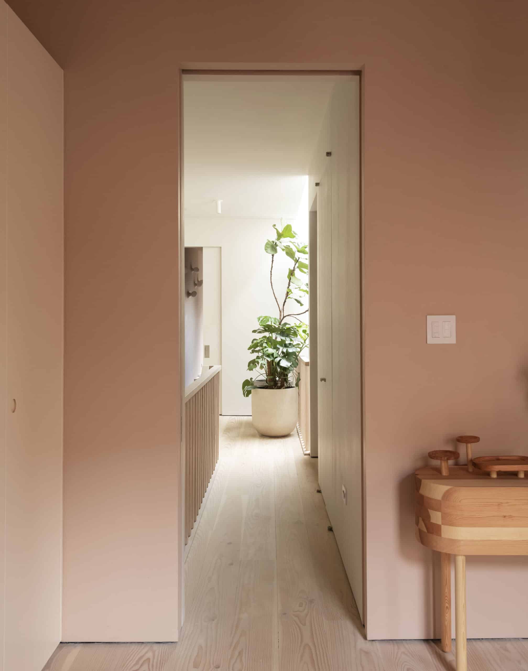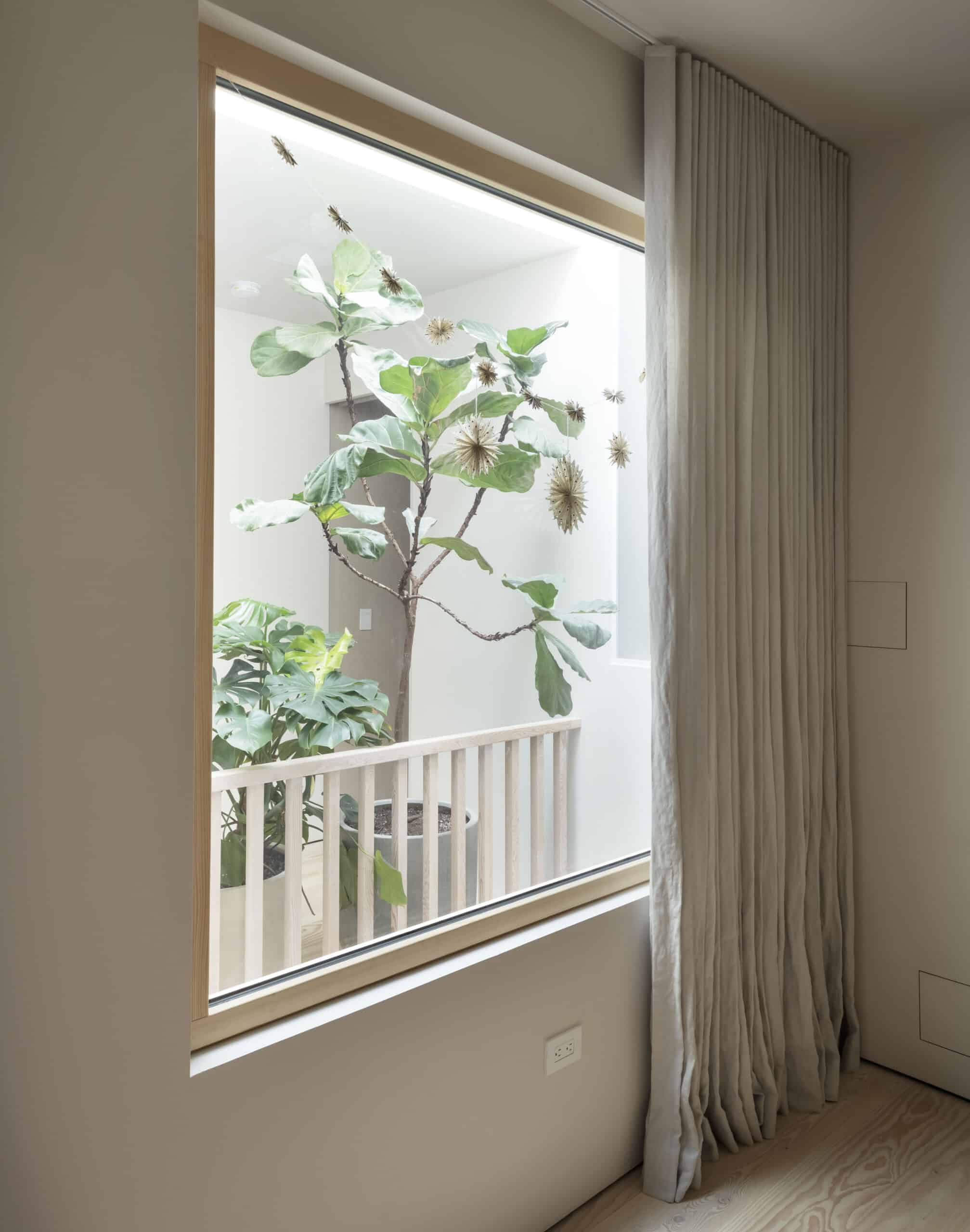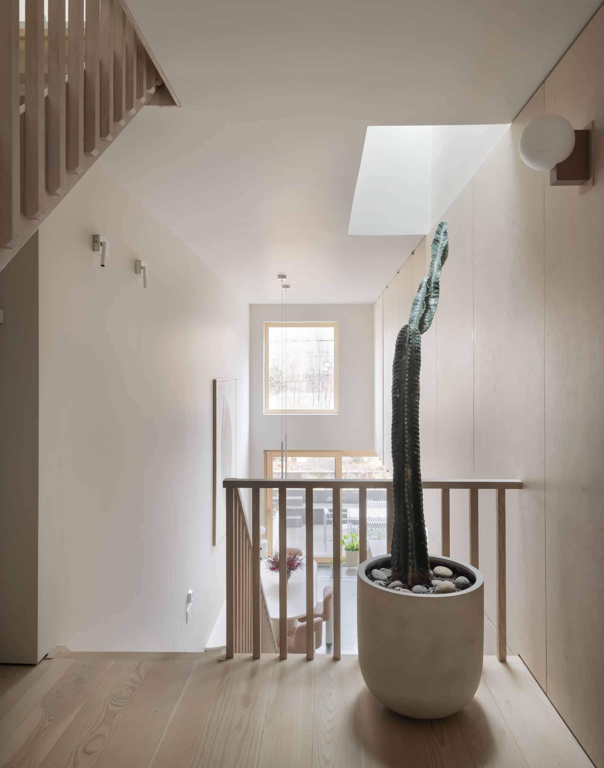 A new 3-by-10-foot skylight illuminates the entire building and provides a visual throughline from the top floor, where there are three bedrooms, to the kitchen two levels below. The living room sits on the floor in between, at the front of the house. A switchback stair with open risers ties together the levels without reducing transparency. “There’s a visual connection townhouses often lack,” Ransom said. “Part of the goal was allowing the occupants to find privacy, but not be cloistered.”