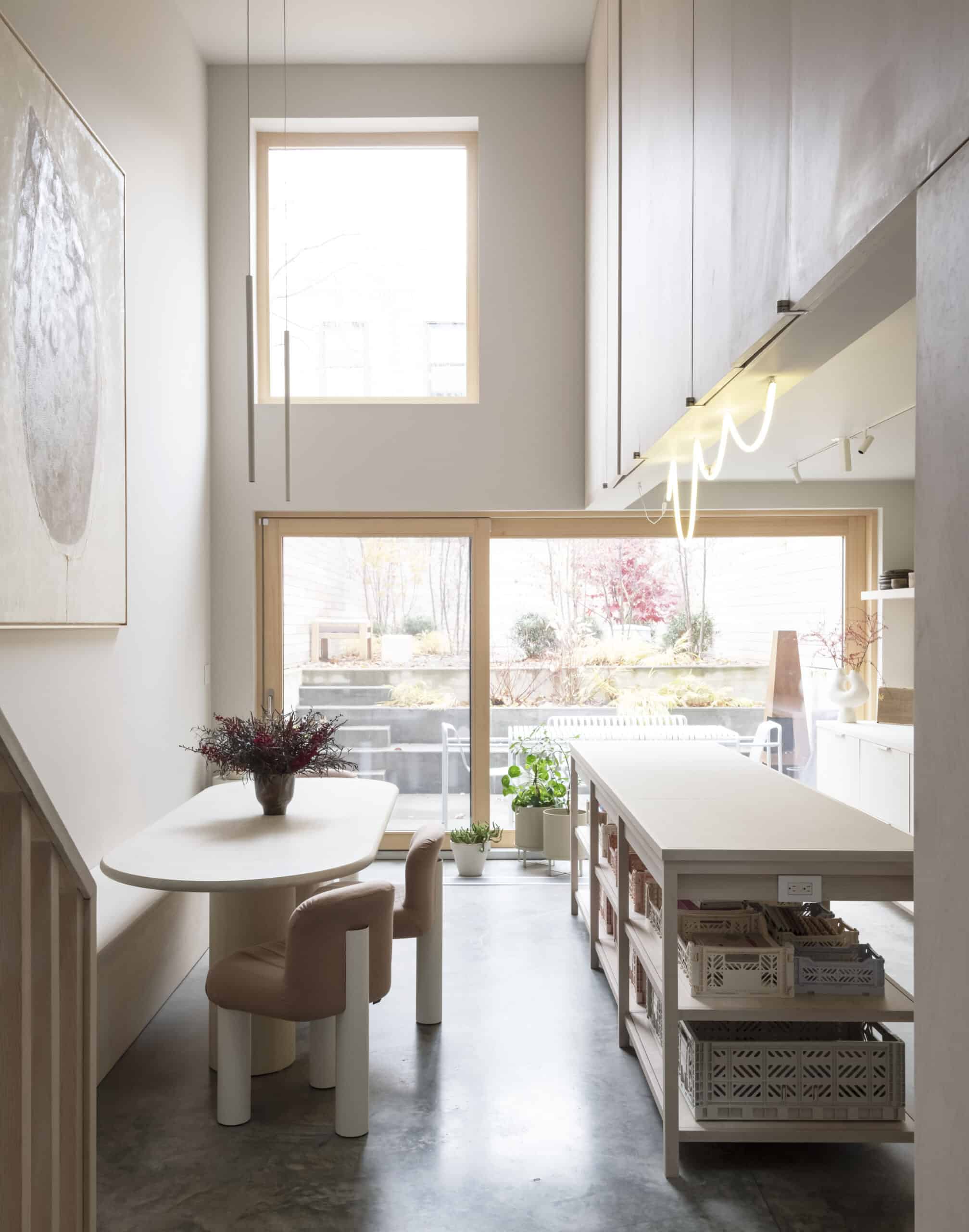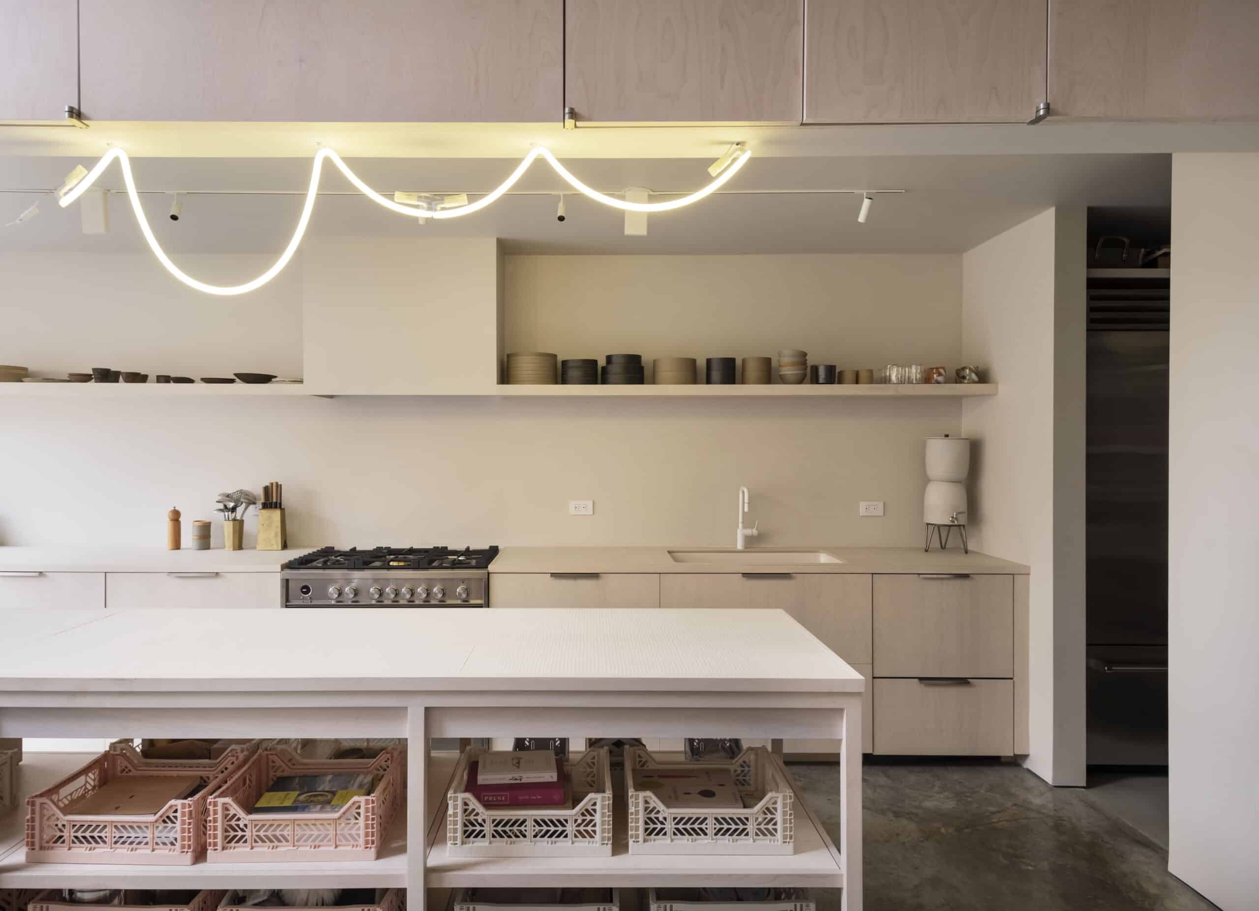 The kitchen design — a collaboration with Studio Oink — was “super simple,” Ransom said, with birch ply cabinetry; ceramic tile countertops from Nutina, a Spanish company; and an abundance of storage. A custom neon light fixture hangs over the island.