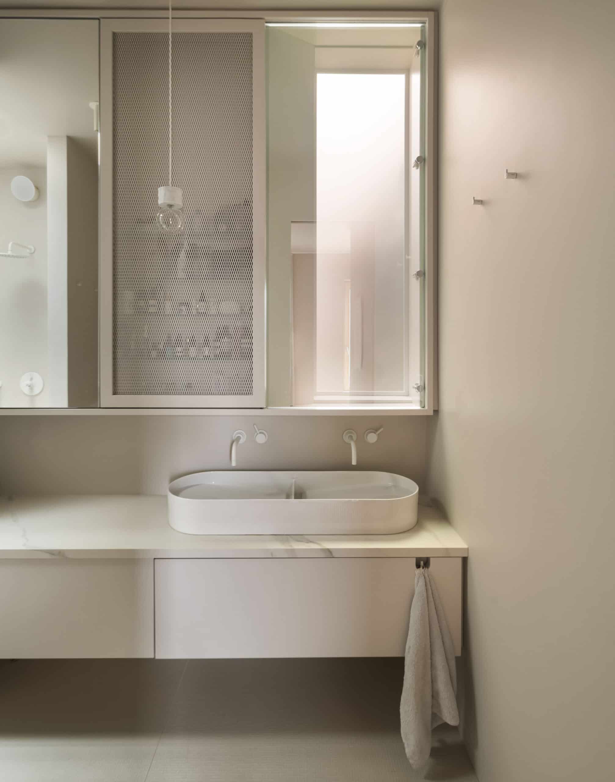 There are two full baths on the top floor — a primary bath with a lozenge-shaped vessel sink and metal mesh cabinet, and a children’s bath with two separate alcoves.