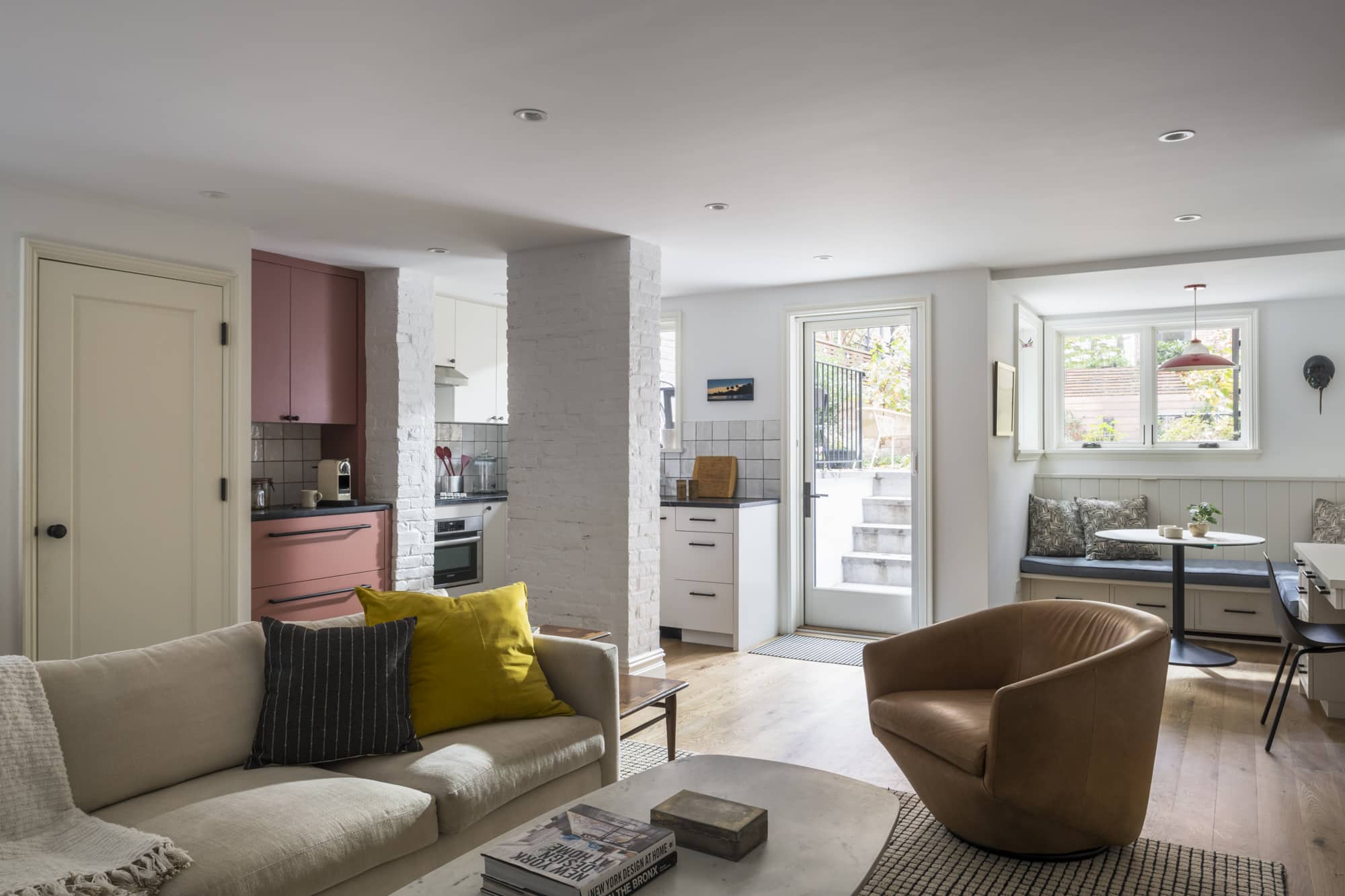 The architects left a structural brick pillar exposed in the downstairs unit, which runs the full width of the house. With a kitchenette, seating banquette, built-in desk, and TV watching area, the space serves a multitude of purposes.