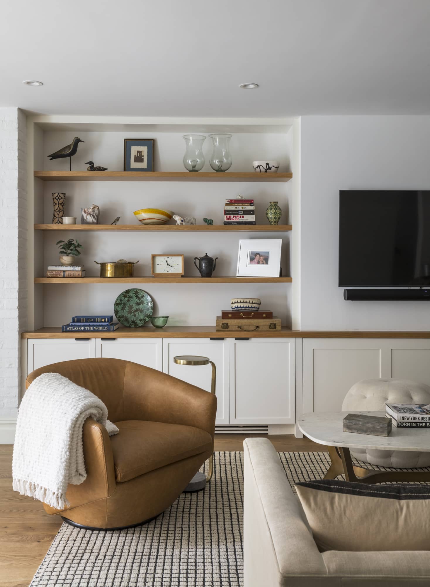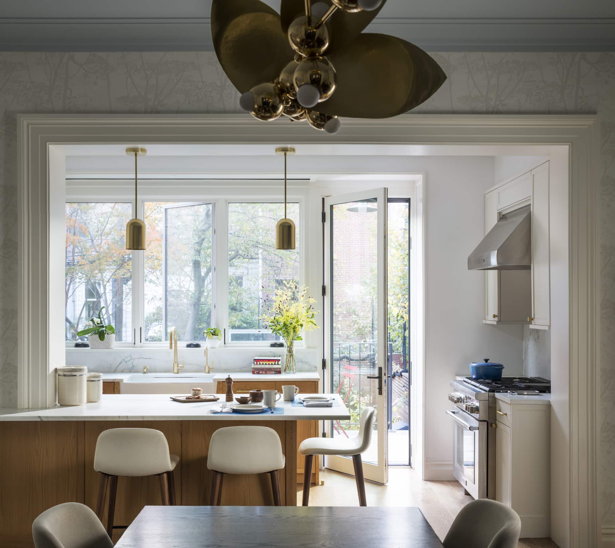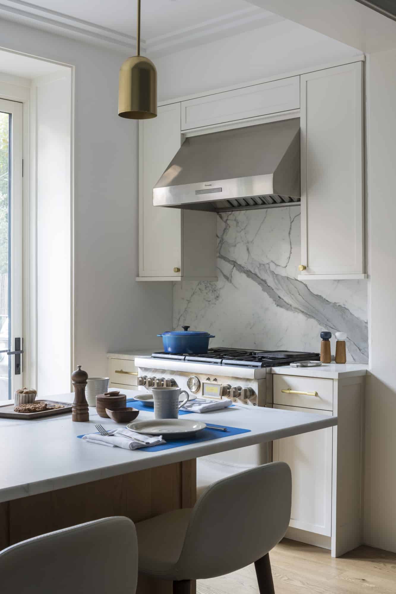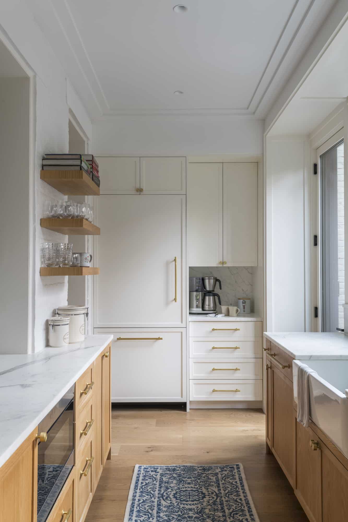 “We thought of the kitchen in terms of different zones — a central zone with a sink and island peninsula in warm white oak millwork, with seating for breakfast and homework,” Chemello said. “Flanking the party walls on left and right, in off-white painted millwork, are a cooking zone with a range on one side and a fridge, pantry, and appliance garage opposite.” The sink and countertops are white marble, as is the backsplash behind the stove.
