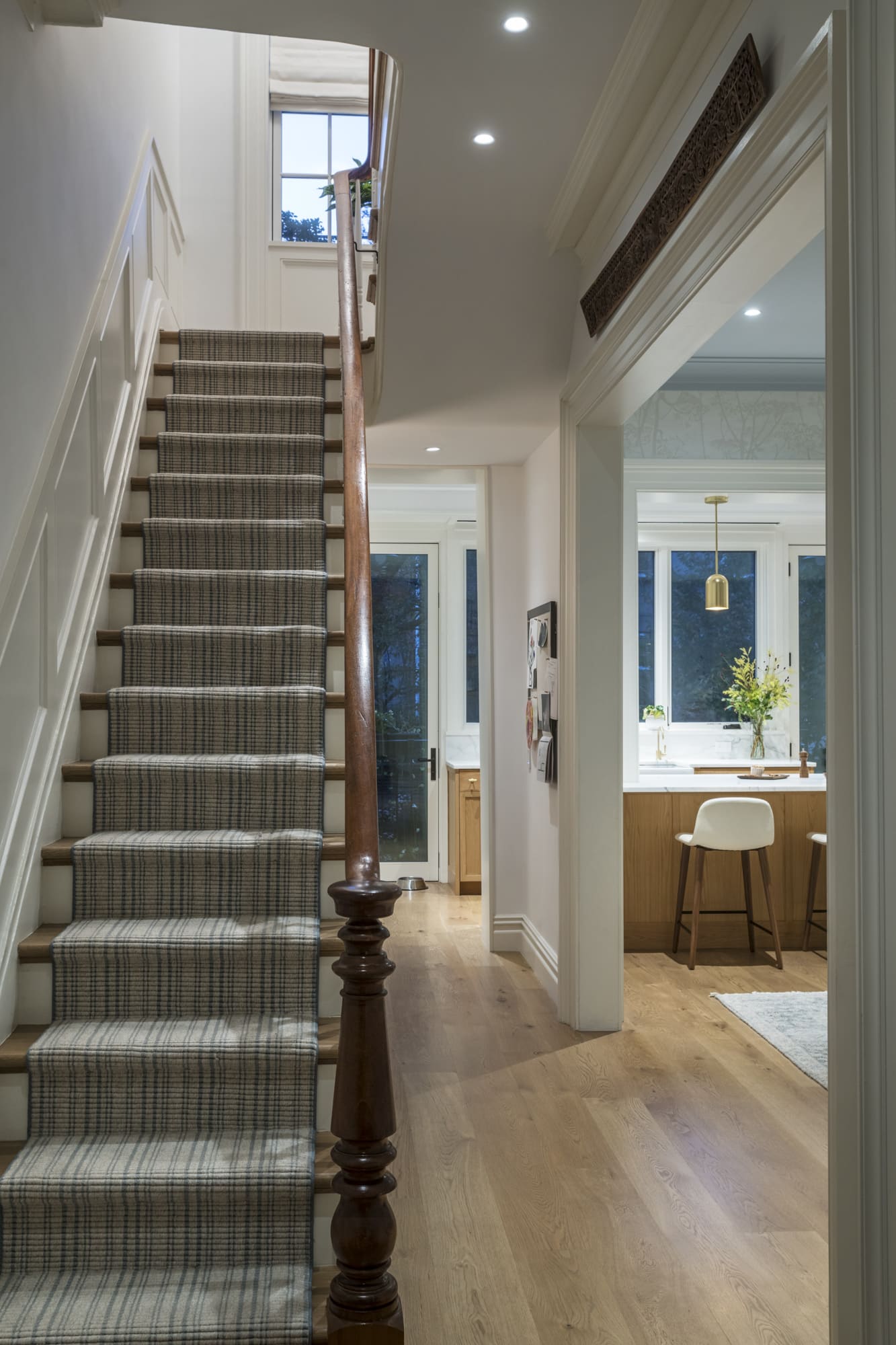 “The stair was original, but not in the best condition, and the second floor had pretty significant sag around the stair opening,” Chemello said. “We straightened the floors and re-supported the stair from the underside,” salvaging the original newels and railings.