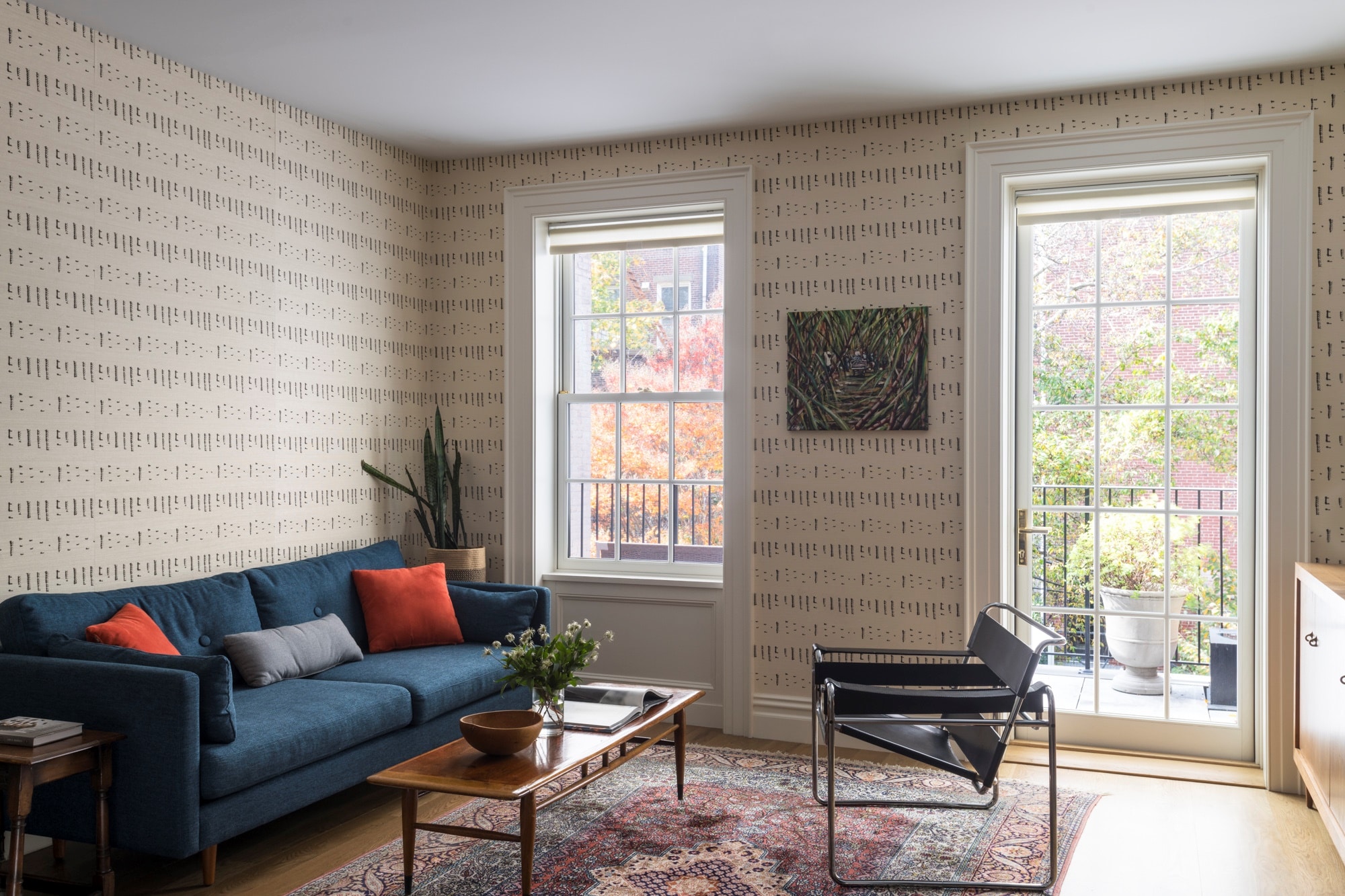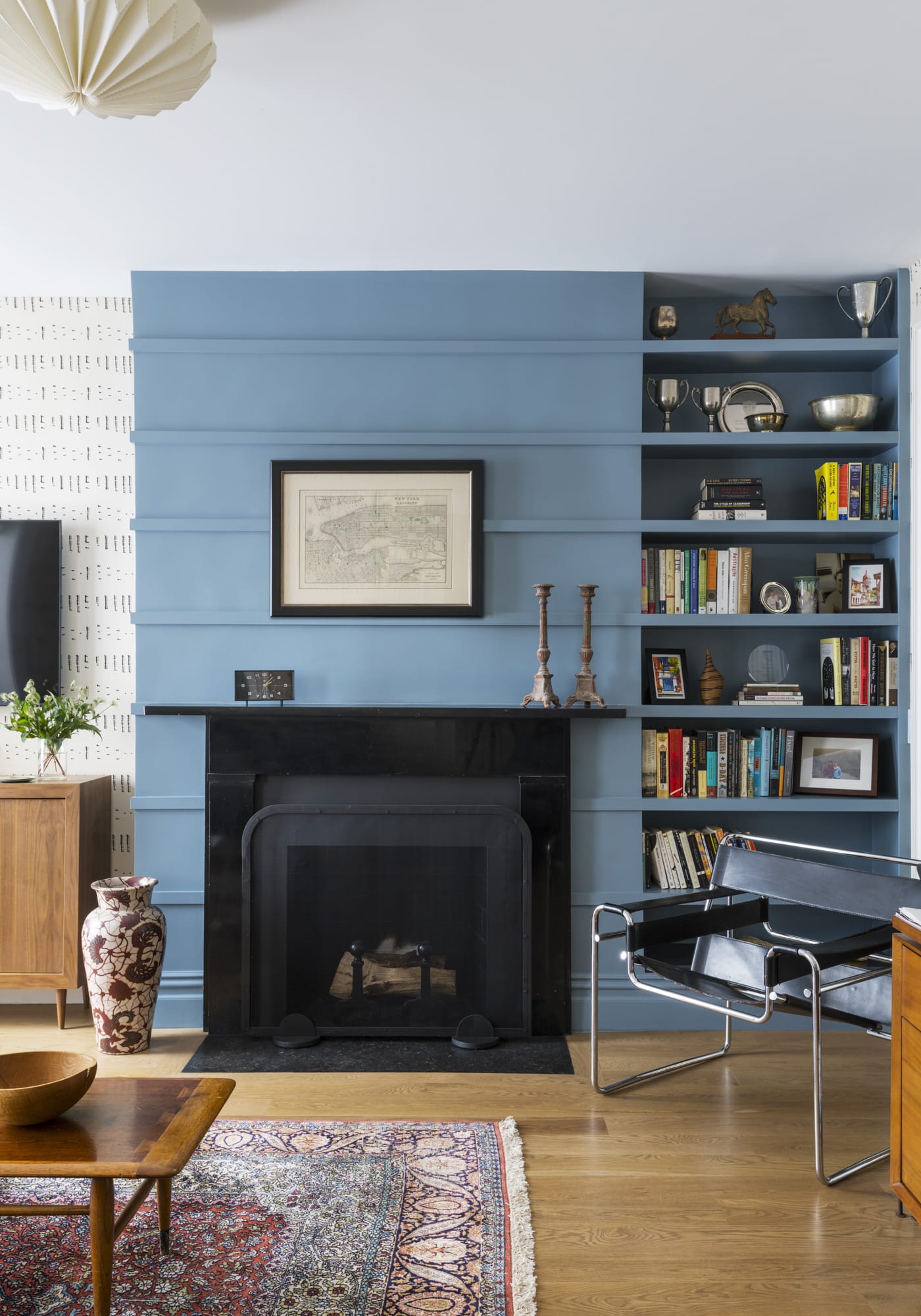 On the floor above, a study/sitting room with access to an outdoor deck adjoins the primary bedroom at the front of the building. A blue-painted wall of new millwork in the study incorporates bookshelves and an existing wood burning fireplace.