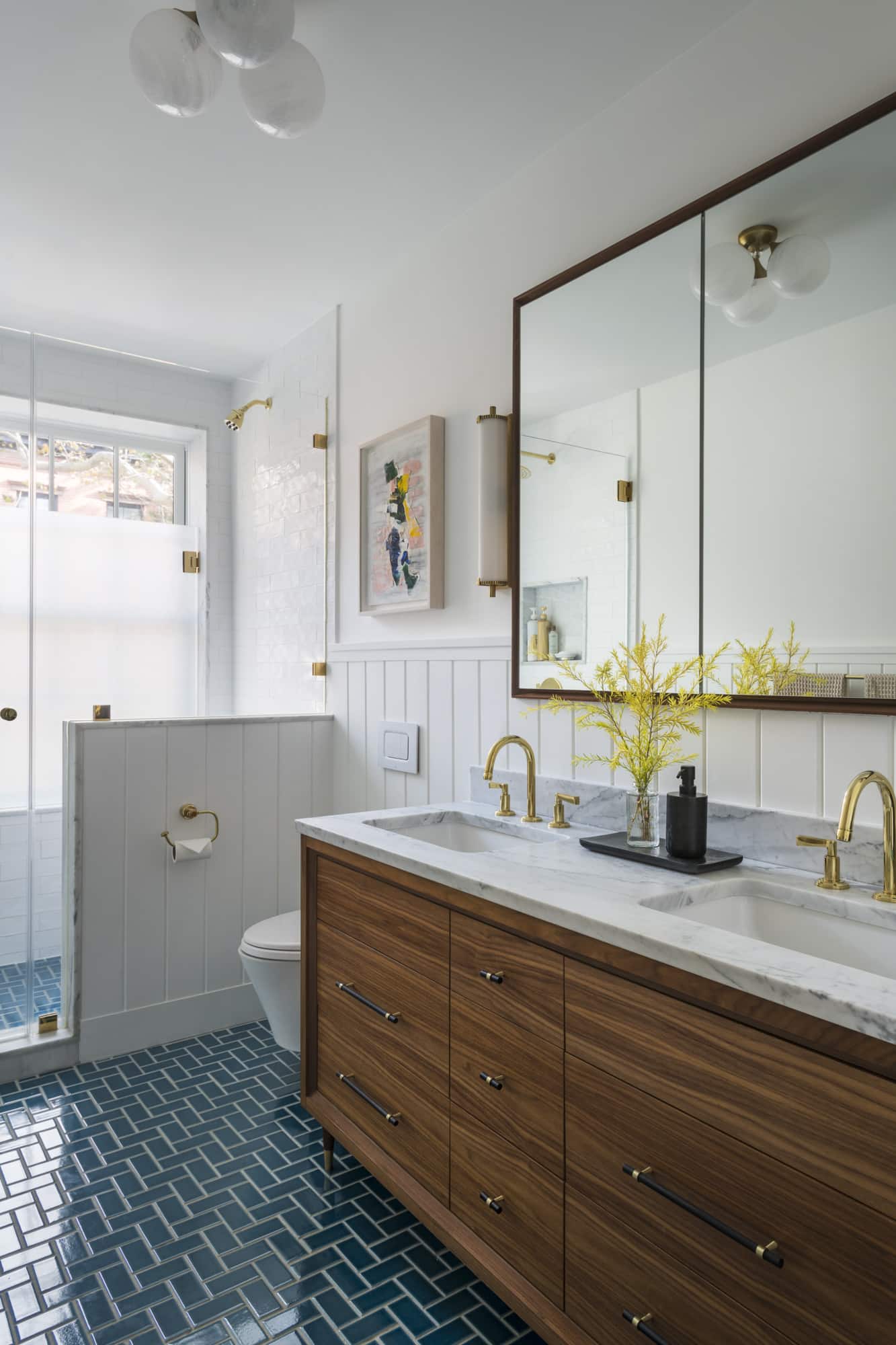 The primary bath was reconfigured in its entirety. “The client was OK with forgoing a tub, because available space was on the narrow side,” Chemello said. Rich blue Fireclay tiles clad the floor. A custom walnut vanity and satin brass hardware have a transitional feel.